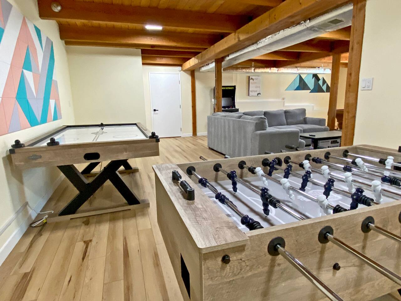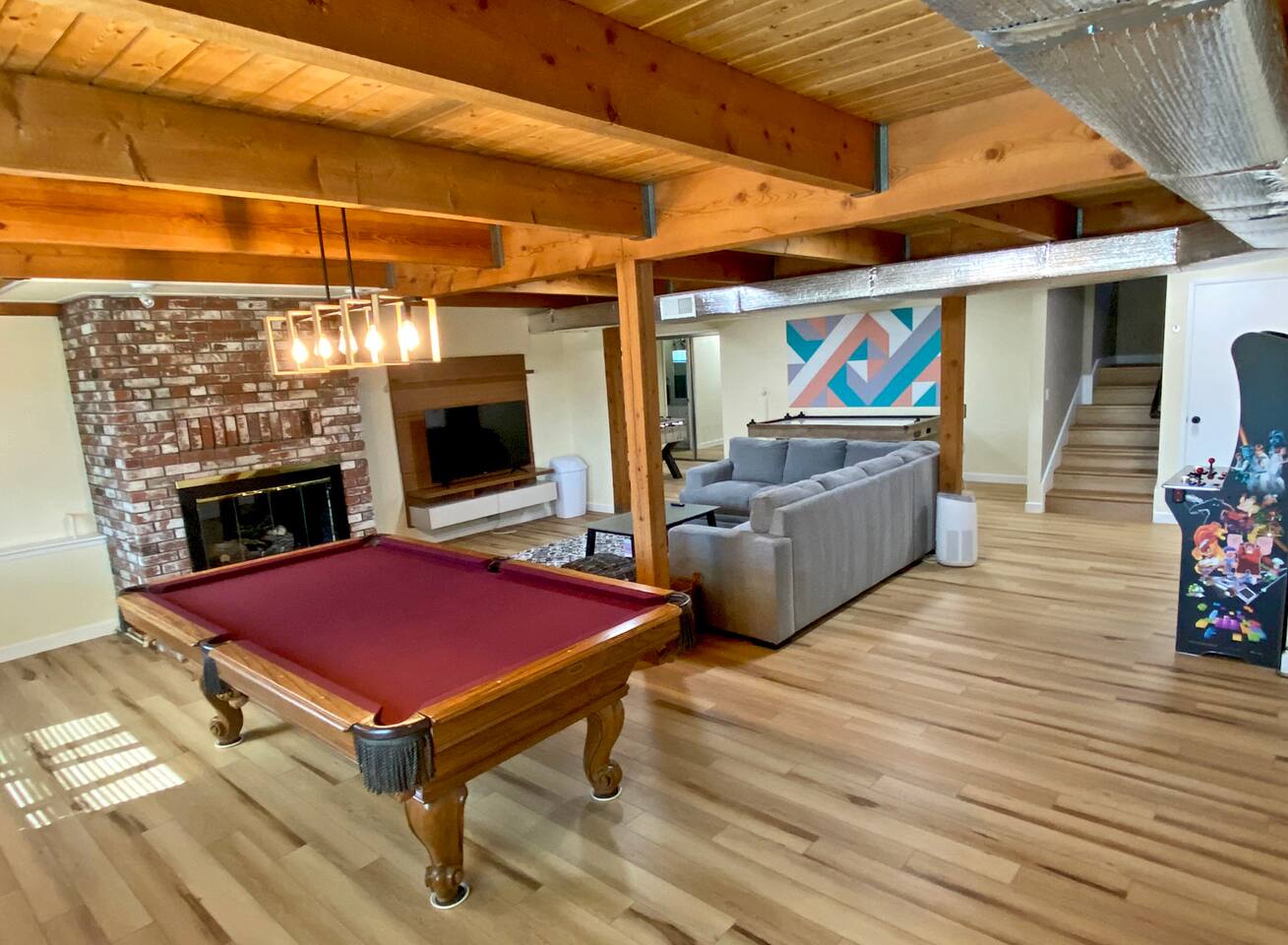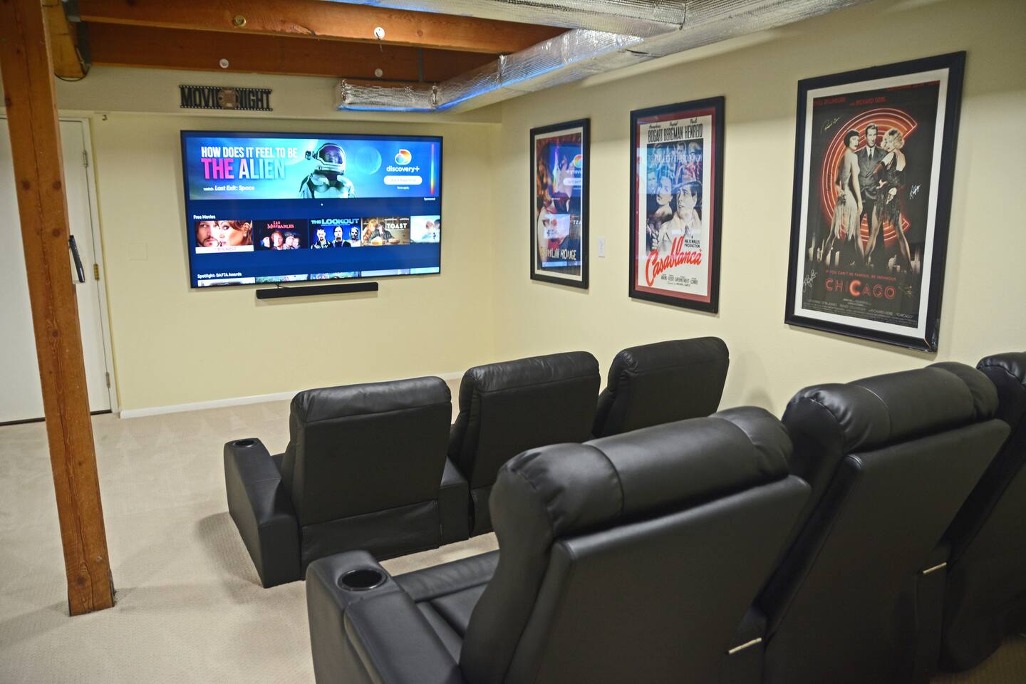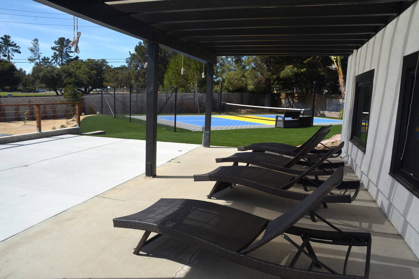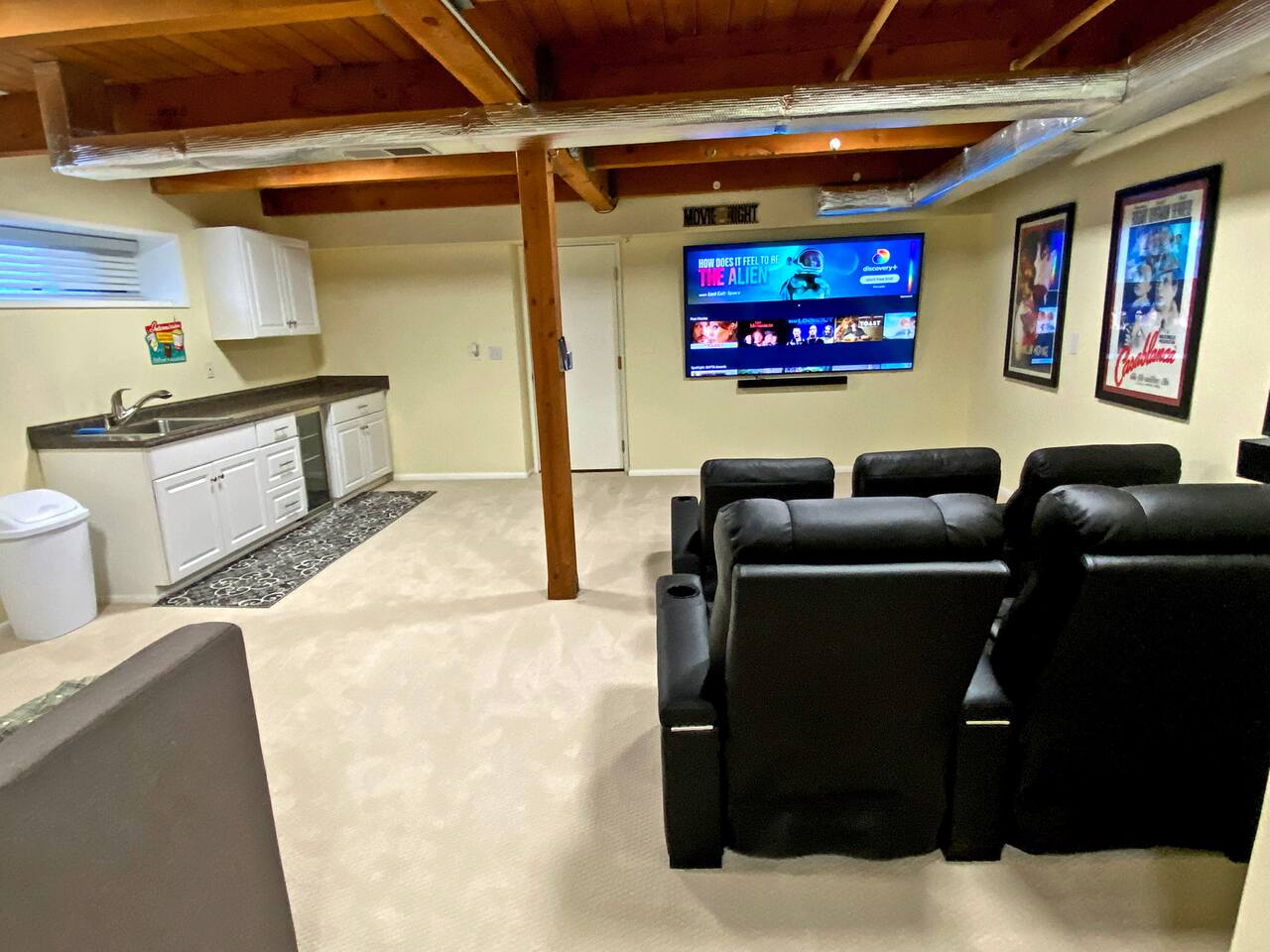 The game room is set up with a pool table, air hockey, foosball table, and board games. The theater room has 6 seats and 85” TV with surround sound and also has an extra day bed with trundle to accommodate larger groups. The office nook with two desks is a perfect place to stay productive. An outdoor covered patio is set up with outdoor kitchen and BBQ to enjoy a meal while watching the sunset. The backyard features 3000 sq feet a newly installed turf with bocce ball court and a sports court for pickle ball or badminton. A fire pit with seating for 8 to warm up in the evenings overlooks the remainder of the yard with established and newly planted fruit trees. Good parking in front of the home for 4 vehicles.