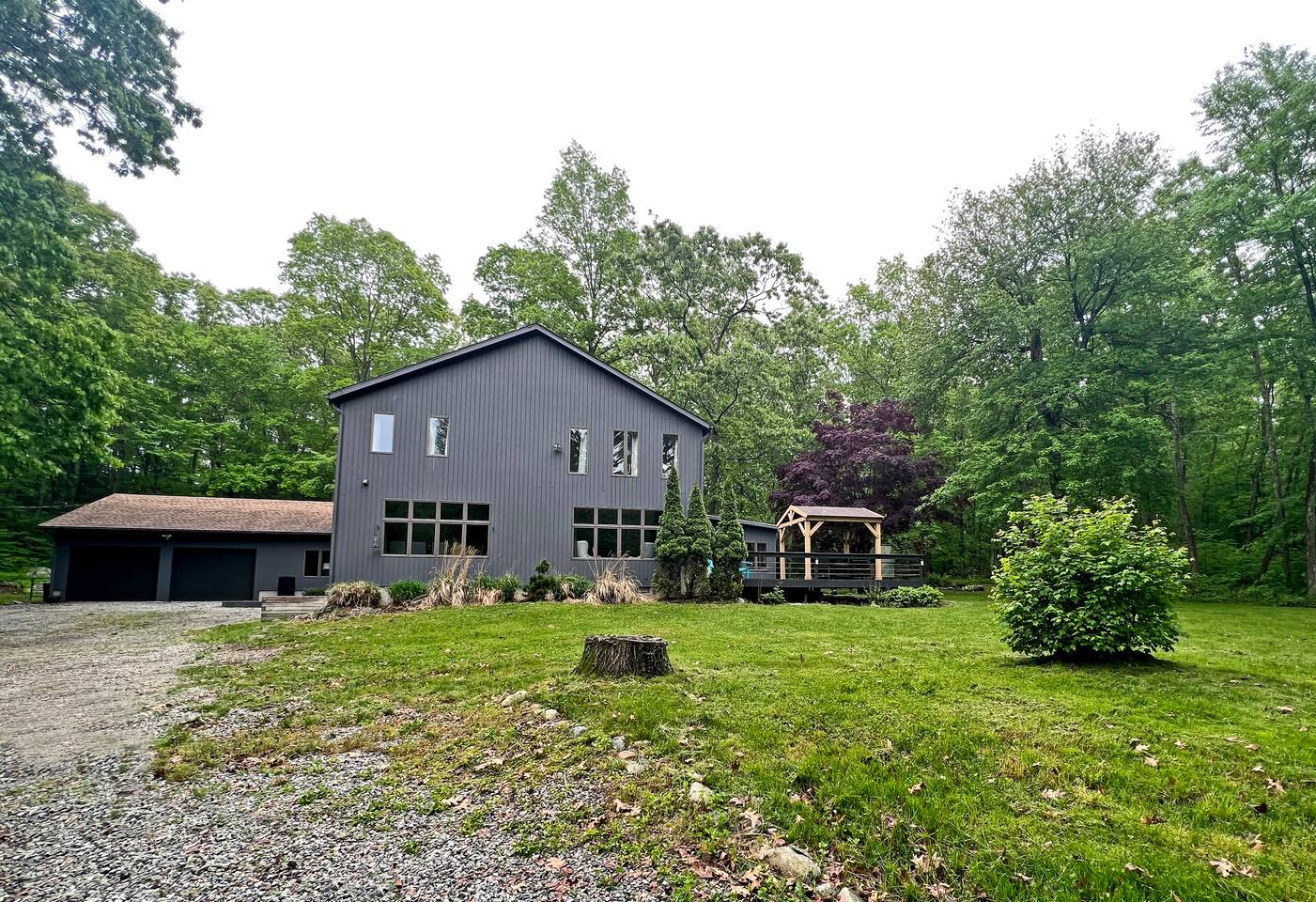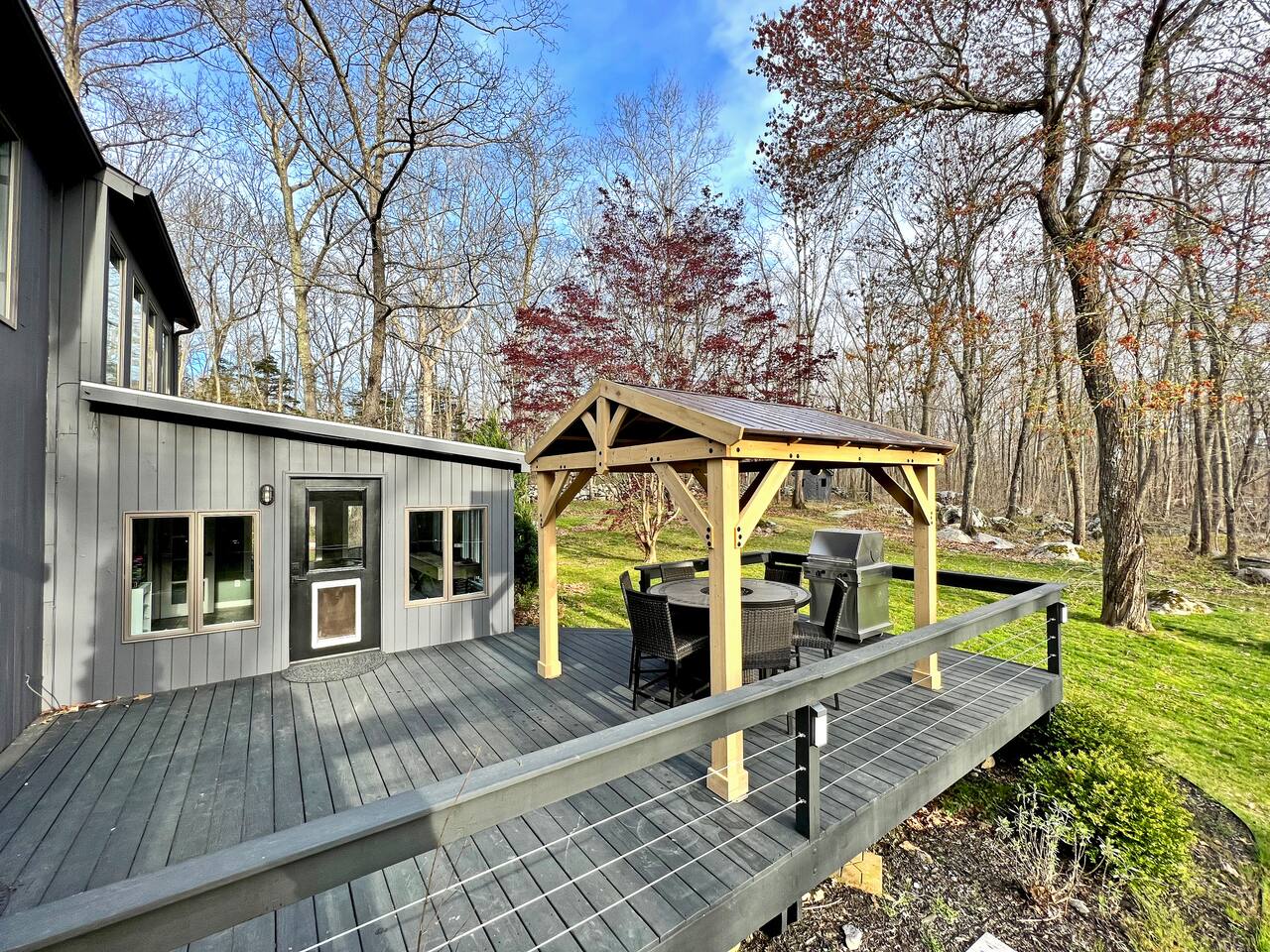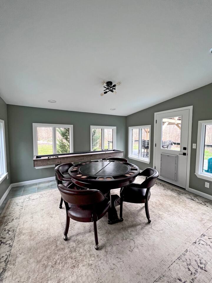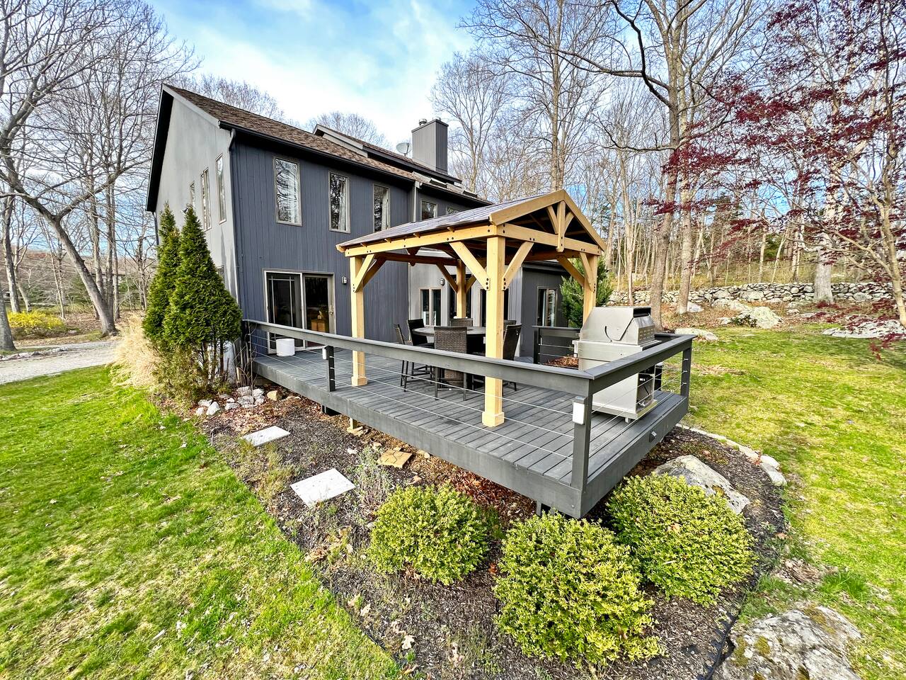 As you enter the main level, you'll see an impressive vaulted ceiling over a newly felted full size pool table. The game room off the living room has a poker table and shuffleboard table as well as several board games for the family to enjoy. The open concept living room can seat 8 in front of the 70" TV and 4 at the kitchen bar while the dinning table seats 10 comfortably. The 2 bedrooms on main level are furnished a full bed and a twin bed that has an additional pull out bed. On the second level, you'll find a master bedroom the size of a small apartment with a king bed, 2 desks and a sitting area with a convertible couch. The master bedroom has over 10 windows and 2 skylights allowing you to soak in the views whether you are relaxing or catching up on some emails. The second bedroom upstairs has a queen bed and also writing desk. To finish off the second level is a loft which overlooks the great hall with an extra day bed that can be used for larger groups. Outside, you'll find a generous outdoor deck and gazebo for bbq dinners or just to envoy the beautiful New England evening colors. The outdoor table with a center fire pit seats 6 and the small deck off the great hall is intimate space to relax and enjoy the view. To enter the property, you'll come down a private gravel road to a private gravel driveway. Centrally Located: 2 Miles: Stonington Borough 3 Miles: Mystic Aquarium 4 Miles: Downtown Mystic 5 Miles: Stonington Vineyards 7 Miles: Downtown Westerly 18 Miles (30 minutes): Mohegan Sun Casino