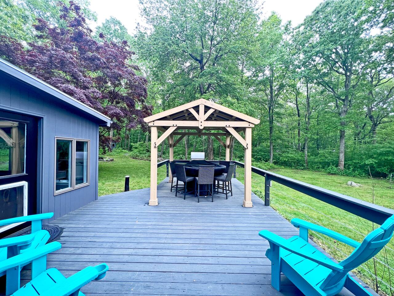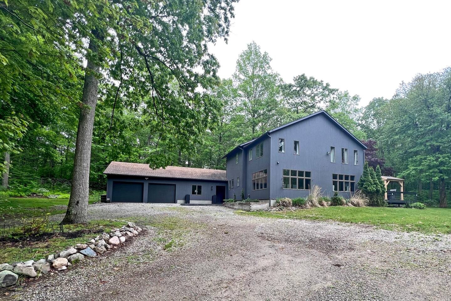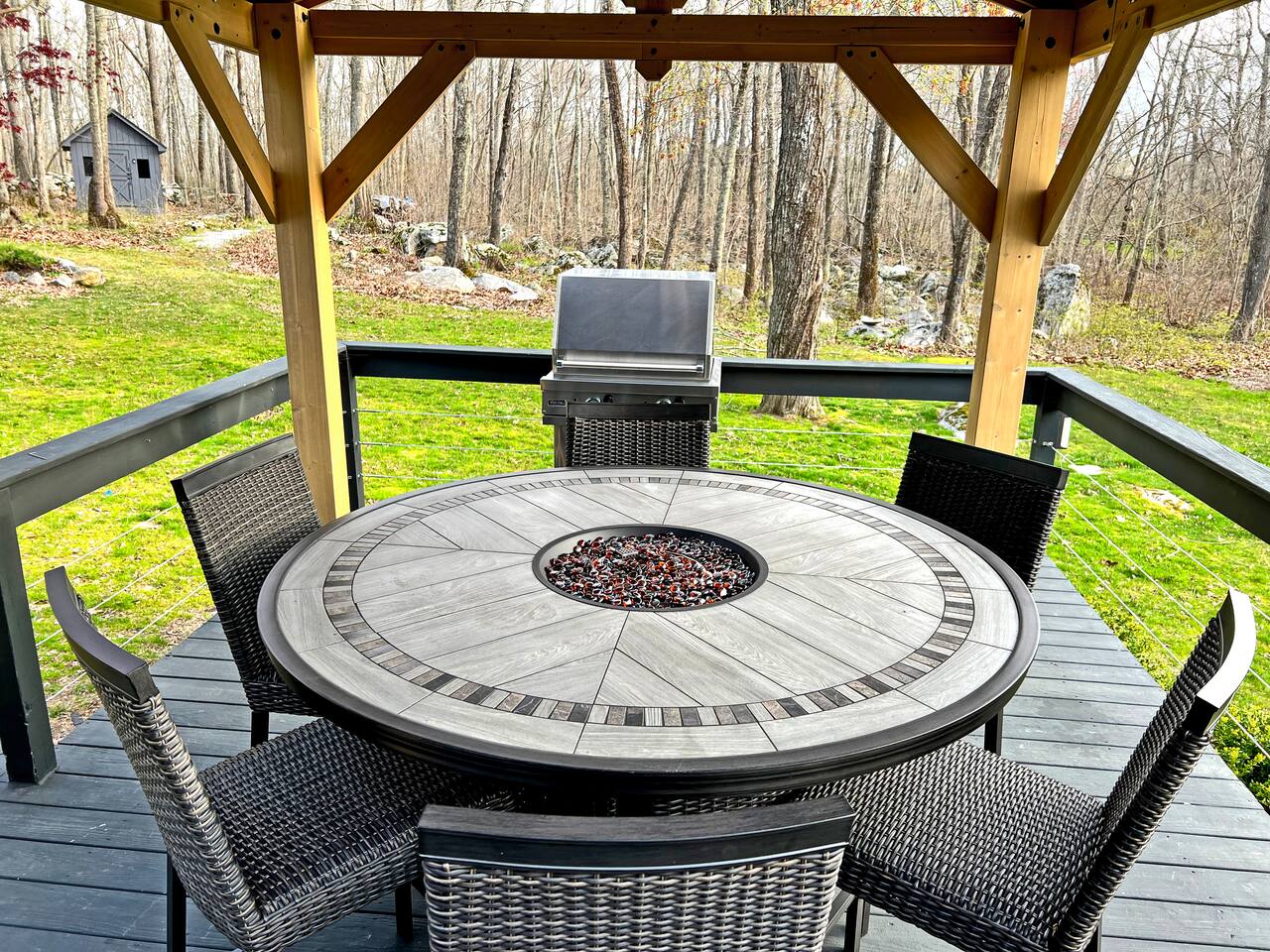 As you enter the main level, you'll see an impressive vaulted ceiling over a newly felted full size pool table. The game room off the living room has a poker table and shuffleboard table as well as several board games for the family to enjoy. The open concept living room can seat 8 in front of the 70" TV and 4 at the kitchen bar while the dinning table seats 10 comfortably. The 2 bedrooms on main level are furnished a full bed and a twin bed that has an additional pull out bed. On the second level, you'll find a master bedroom the size of a small apartment with a king bed, 2 desks and a sitting area with a convertible couch. The master bedroom has over 10 windows and 2 skylights allowing you to soak in the views whether you are relaxing or catching up on some emails. The second bedroom upstairs has a queen bed and also writing desk. To finish off the second level is a loft which overlooks the great hall with an extra day bed that can be used for larger groups. Outside, you'll find a generous outdoor deck and gazebo for bbq dinners or just to envoy the beautiful New England evening colors. The outdoor table with a center fire pit seats 6 and the small deck off the great hall is intimate space to relax and enjoy the view. To enter the property, you'll come down a private gravel road to a private gravel driveway. Centrally Located: 2 Miles: Stonington Borough 3 Miles: Mystic Aquarium 4 Miles: Downtown Mystic 5 Miles: Stonington Vineyards 7 Miles: Downtown Westerly 18 Miles (30 minutes): Mohegan Sun Casino
